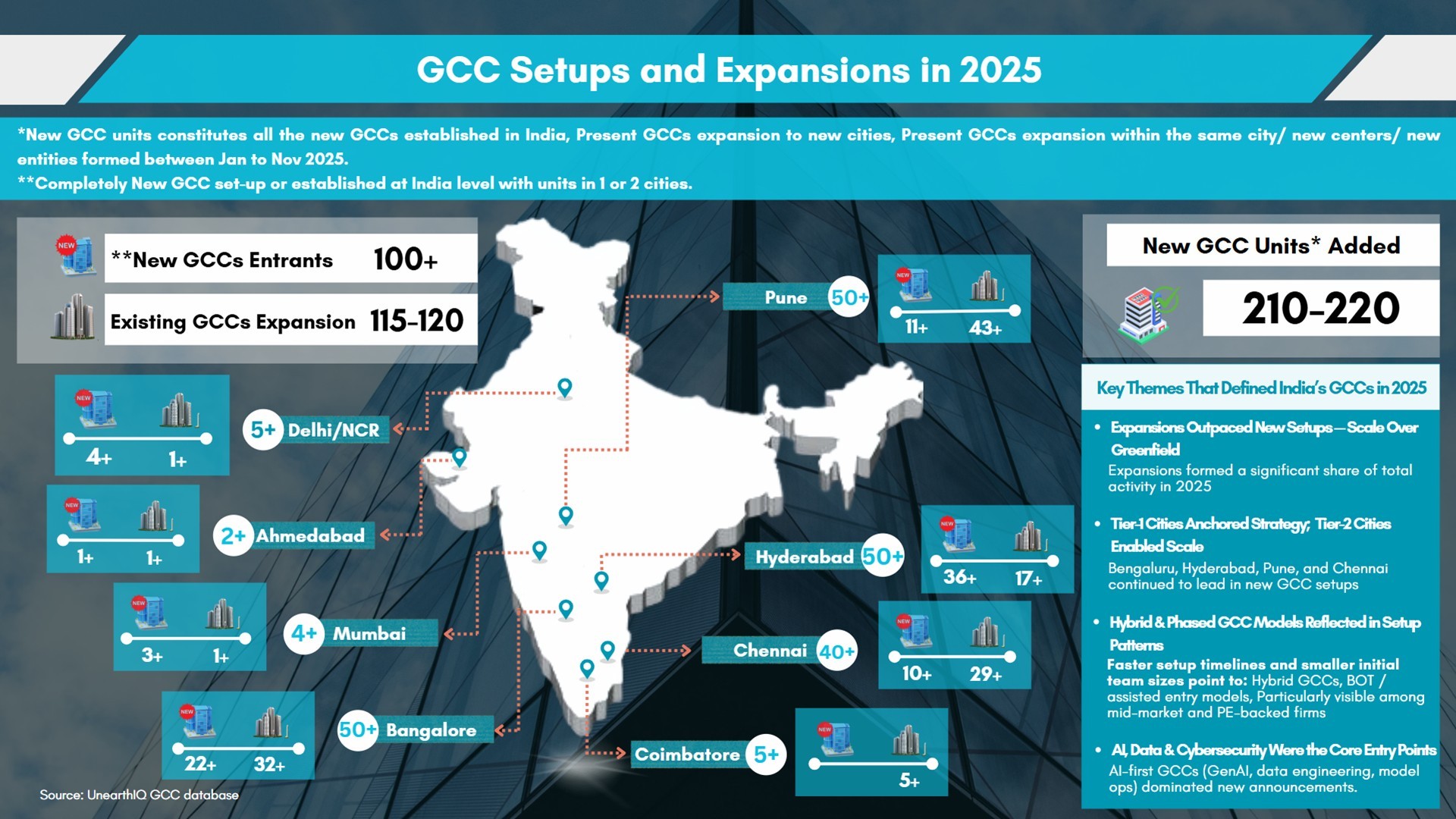 India saw 100+ new GCC entrants in 2025 — firms building India operations for the first time, with registered entities and teams on the ground. What is equally significant is that existing GCCs announced 115–120 expansion moves in the same period, pushing total new GCC unit additions to 210–220.