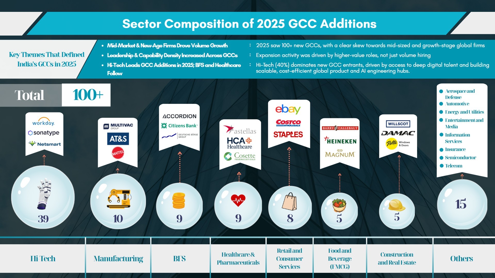 Construction & Real Estate (5 new GCCs, ~5%): Willscot, DAMAC, and Pella were among the entrants in this segment.