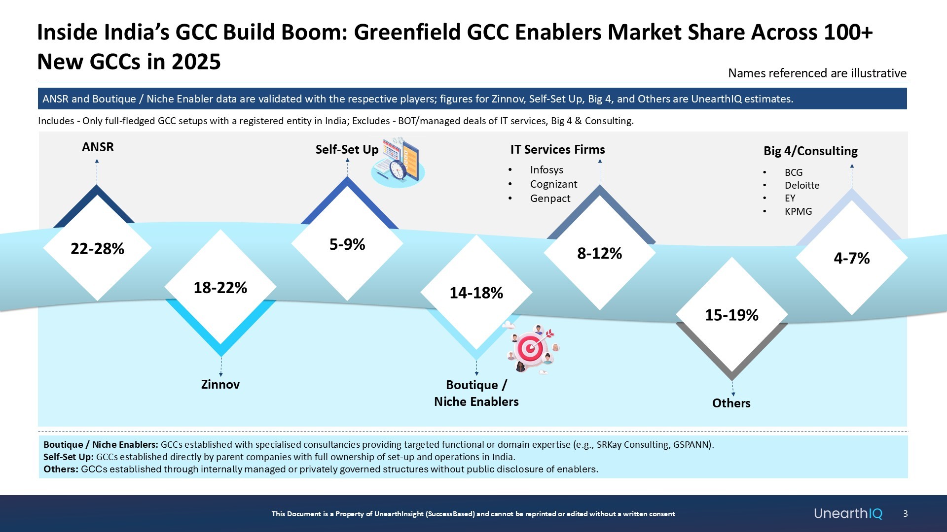 Leading GCC enablers like ANSR and Zinnov have refined their delivery models to set up full-fledged GCCs in under 90 days — from entity registration to operational teams. This speed has been a key reason why mid-market and PE-backed firms choose specialist enablers over doing it alone. ANSR, which held 22–28% of the greenfield enabler market share in 2025, and Zinnov at 18–22%, were the top two players in this space.