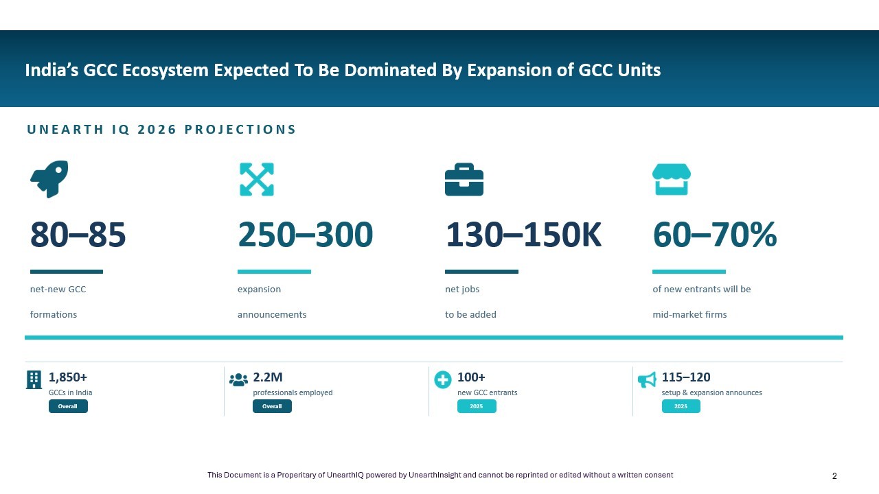 The first quarter of 2026 is likely to be comparatively slower, as geopolitical uncertainty, including US tariff policy, the ongoing conflict in West Asia, and US-China tensions, has prompted many large multinationals to pause or extend their evaluation timelines. New GCC announcements are expected to pick up through the second half of the year as macro clarity improves.