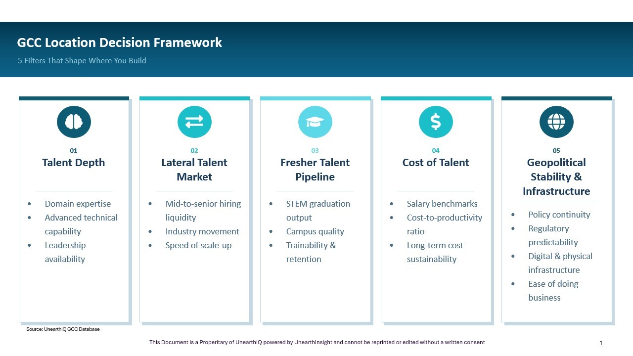 With multiple credible destinations in play, location decisions require a structured lens. UnearthIQ assesses markets across five filters: talent depth, lateral hiring liquidity, fresher pipeline strength, cost-to-productivity ratio, and geopolitical and infrastructure stability. No market wins on all five — the right choice depends on which filters matter most for the mandate at hand.
