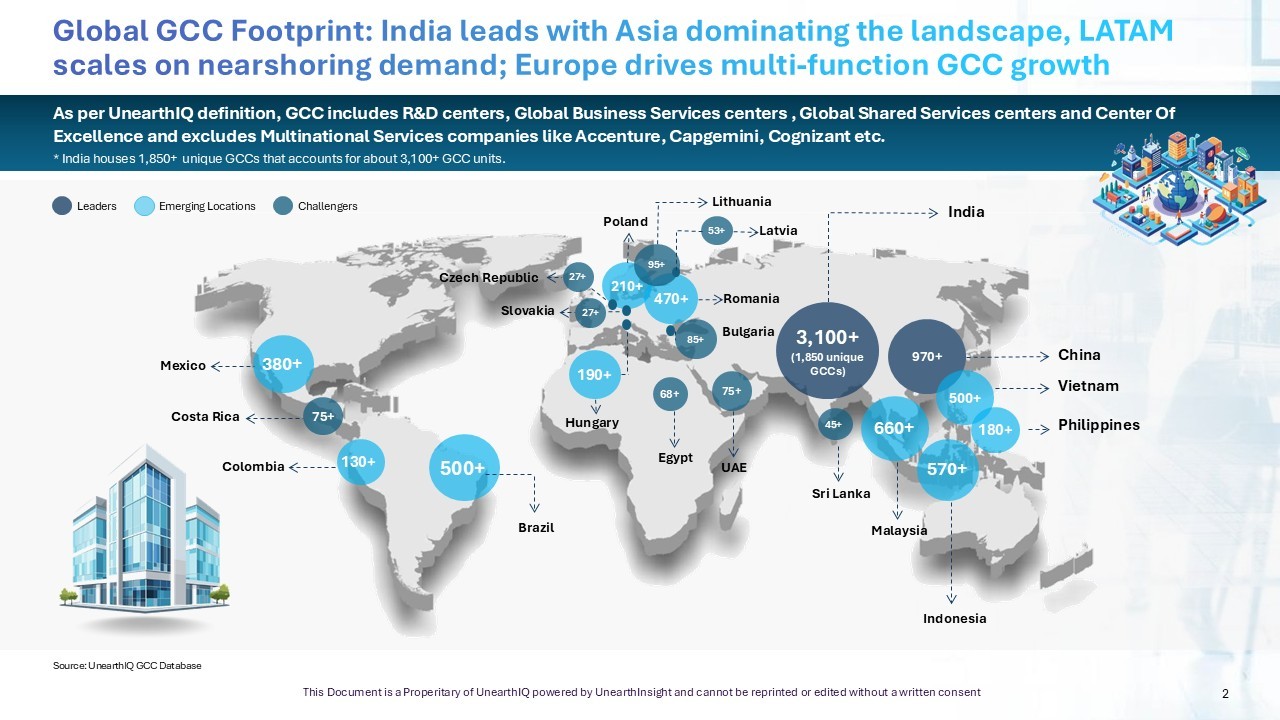 India remains the global anchor with 3,100+ GCC units across 1,850+ unique centres. It offers unmatched scale, a deep digital talent pool, mature ecosystems, and cost competitiveness. Beyond volume, India now hosts complex mandates across product engineering, AI, cybersecurity, data platforms, R&D, and multi-function global operations.